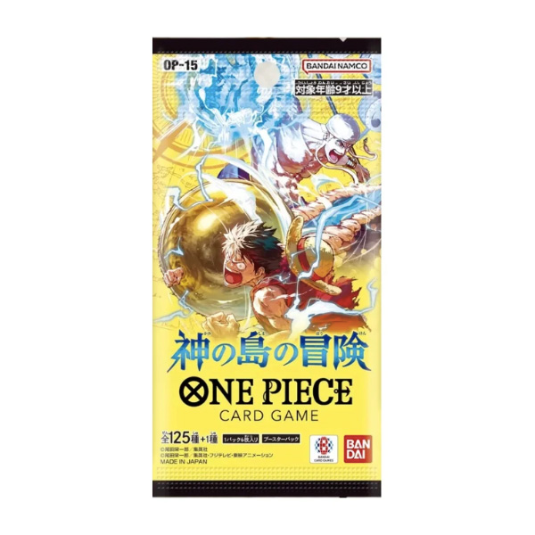 La caja de sobres oficial japonesa del juego de cartas de One Piece OP-15 Aventura en la isla de KAMI incluye a populares personajes de Skypiea, como Monkey D. Luffy, Nico Robin, Nami y Wyper. Esta auténtica edición japonesa presenta ilustraciones y textos originales, lo que la convierte en una excelente adquisición para los coleccionistas de One Piece y los fans del arco argumental de Skypiea. 6 cartas por sobre