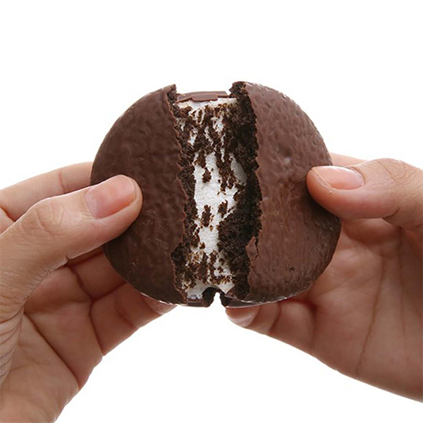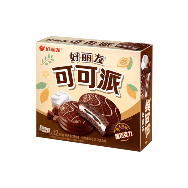 El Orion Choco Pie Dark Chocolate es un pequeño pastelito redondo con un sabor más intenso que el original, que se caracteriza por una combinación distintiva de capas de bizcocho suave, un relleno de malvavisco masticable y una cobertura de chocolate negro.