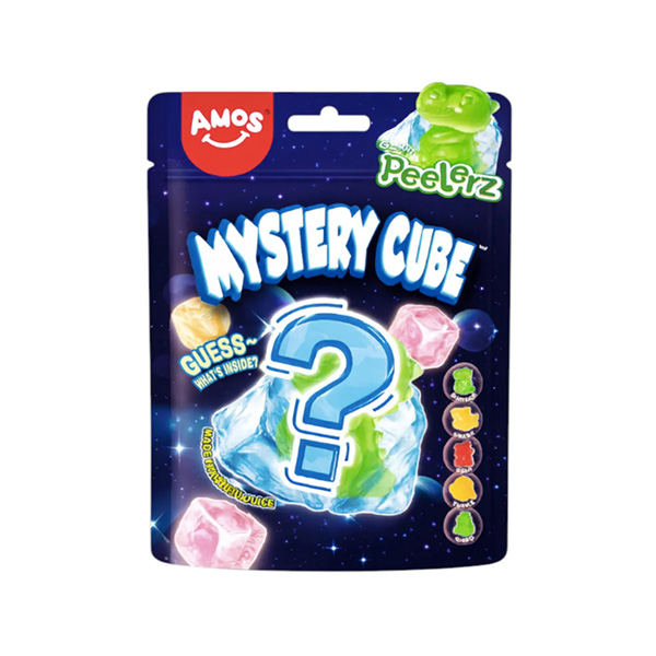The AMOS Peelerz Gummy Mystery Cube are unique, interactive fruit-flavored gummy candies. Each cube has a peelable outer layer that reveals a hidden, animal-shaped gummy inside, such as a shark, hippo, or turtle.