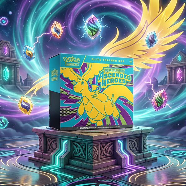 Box Contents: Each Ascended Heroes ETB includes the following English-language items: 9 Booster Packs: Nine individual packs from the Mega Evolution—Ascended Heroes expansion – Promo Card: 1 full-art foil promo card featuring N’s Zekrom – Card Sleeves: 65 illustrated card sleeves typically featuring Mega Dragonite – Energy Cards: 40 Pokémon TCG Energy cards