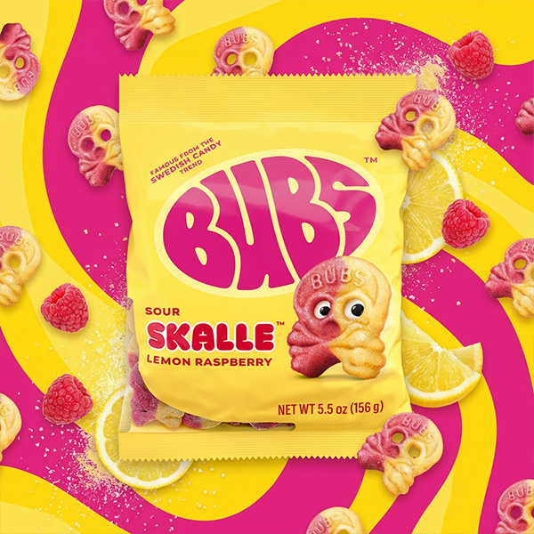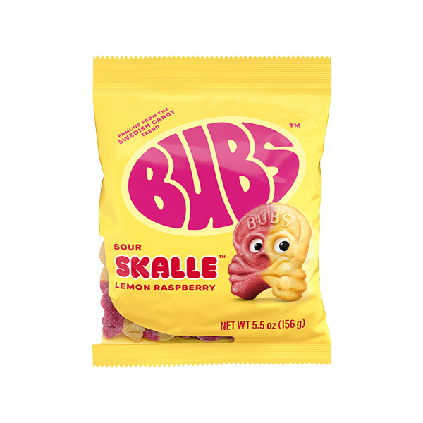The BUBS Fruity Lemon Mix is a pack of popular Swedish vegan sour gummy candies shaped like skulls, featuring a mix of lemon, strawberry, and raspberry flavors