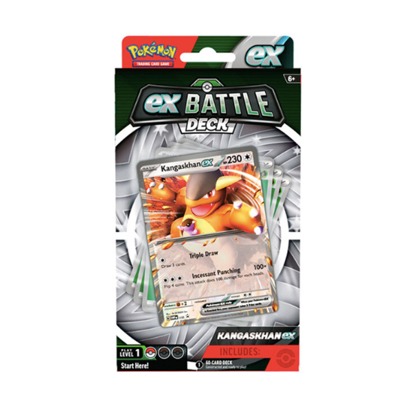 Powerful Pokémon ex are ready to enter the battlefield in the new Pokémon TCG: Battle ex decks! Each 60-card deck is led by an exceptional Pokémon ex and includes everything you need to start playing right away. Let the battle begin! Each Kangaskhan Pokémon TCG Battle ex deck contains: 1 60-card deck ready to play, 3 reference cards, 1 rulebook, 1 player mat, 1 set of damage counters, 1 large coin, 1 card box, 1 strategy sheet, 1 Pokémon Live Trading Card Game code card