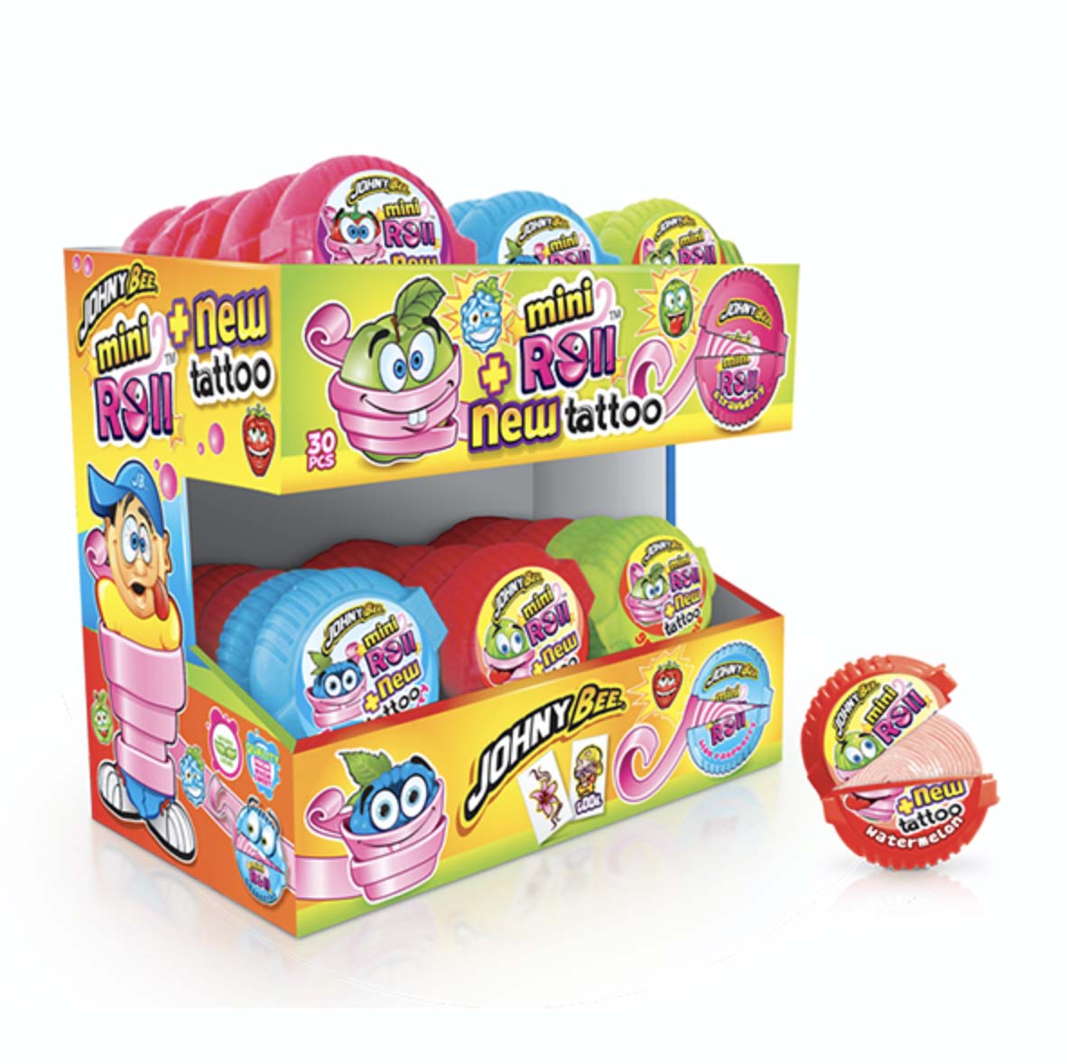 Mini chewing gum Rolls + tattoo, 4 flavors: strawberry, green apple, blue raspberry and watermelon.