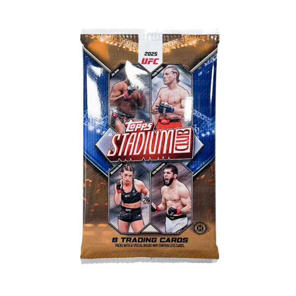 The 2025 Topps Stadium Club UFC collection, the first-ever UFC release for the iconic Stadium Club brand, officially launched on January 23, 2026. Known for its premium “full-bleed” action photography, the set features a mix of current stars, rising rookies, and legends. Base Set: A 300-card base set (the first 200 of which feature numerous parallels). Key Chases: Look for Gold Minted Chrome, Members Only, and Photographer’s Proof parallels. Featured Fighters: Includes stars like Alex Pereira, Conor McGregor, Sean O’Malley, and top rookies like Kai Asakura and Payton Talbott. 8 Cards Per Pack